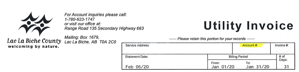 b. Lac La Biche County Utility: enter your Account #, found at the top of the Utility Invoice. Please enter the entire account number, less the dot. e.g. Account # 111313.02. In this case, you would enter 11131302.