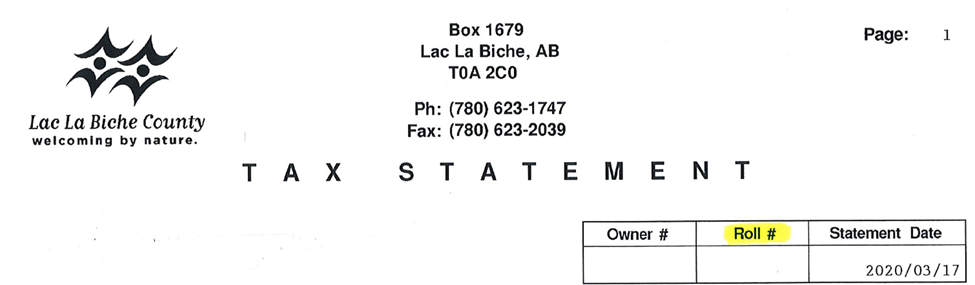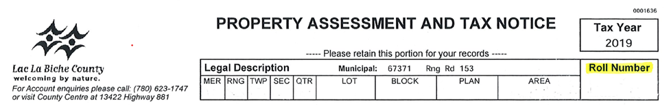 a. Lac La Biche County Taxes: enter your Roll Number, found at the top of your Property Assessment and Tax Notice and also on your Tax Statement